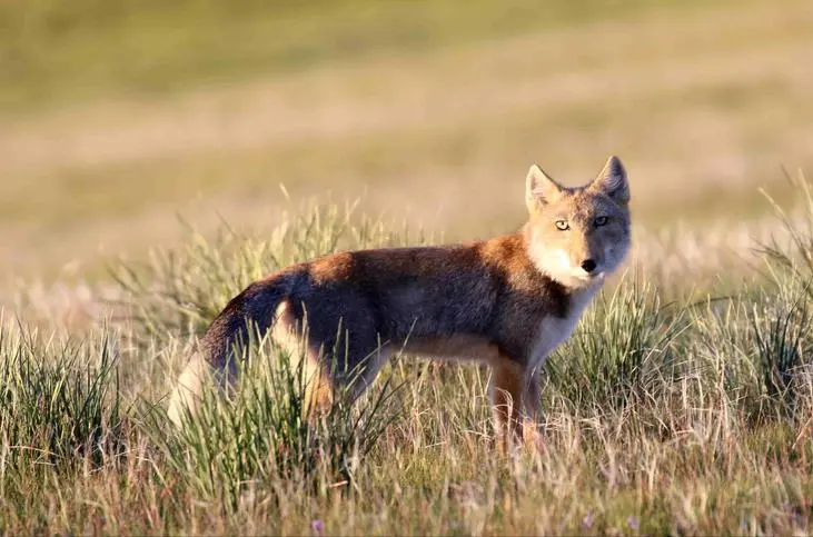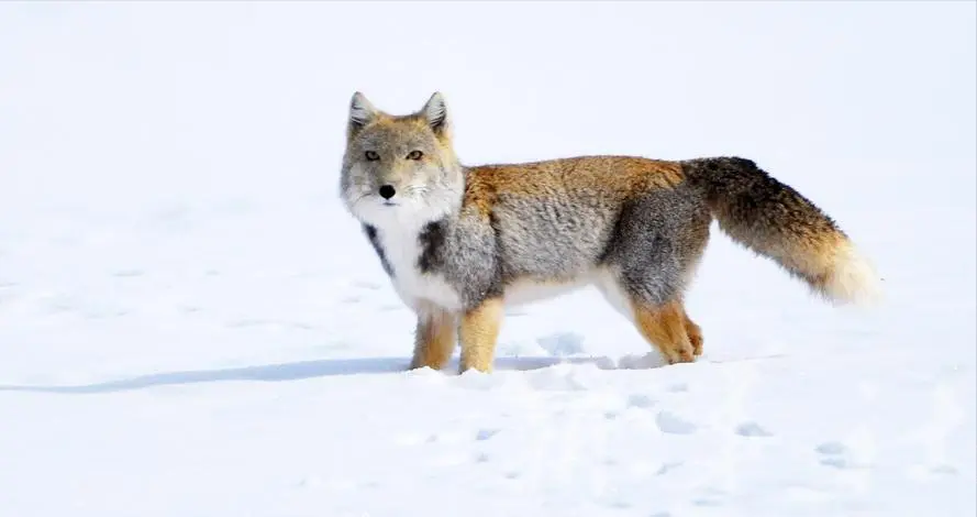藏狐是一种小型狐科动物,身体呈纺锤形,四肢相对较短。其头部较小,吻部细长,耳朵尖而直立,尾巴长而蓬松,全身覆盖着灰褐色的短毛,腹部毛色较浅。藏狐的体重通常在2.5至3.5公斤之间,体长约为50至70厘米,尾长约为30至40厘米。