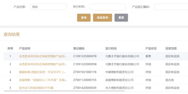 从理财产品名称来看,与往年新发带有"国庆专属"理财产品的情况不同。时代周报记者以"国庆"为关键词在中国理财网搜索发现,截至目前,国庆节专属理财产品共计 5 只,其中 4 只存续,1 只募集,且多为中短期、固收类产品,业绩比较基准上限最高达到 5.4%,为农银理财发布的"农银同心 · 三年开放"价值精选(欢度国庆)。