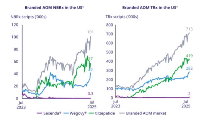 司美格鲁肽减重版(Wegovy,蓝线)在美国的处方接受度受到调配制剂和替尔泊肽的双重冲击。来自:诺和诺德2025第二季度财报电话会议报告
